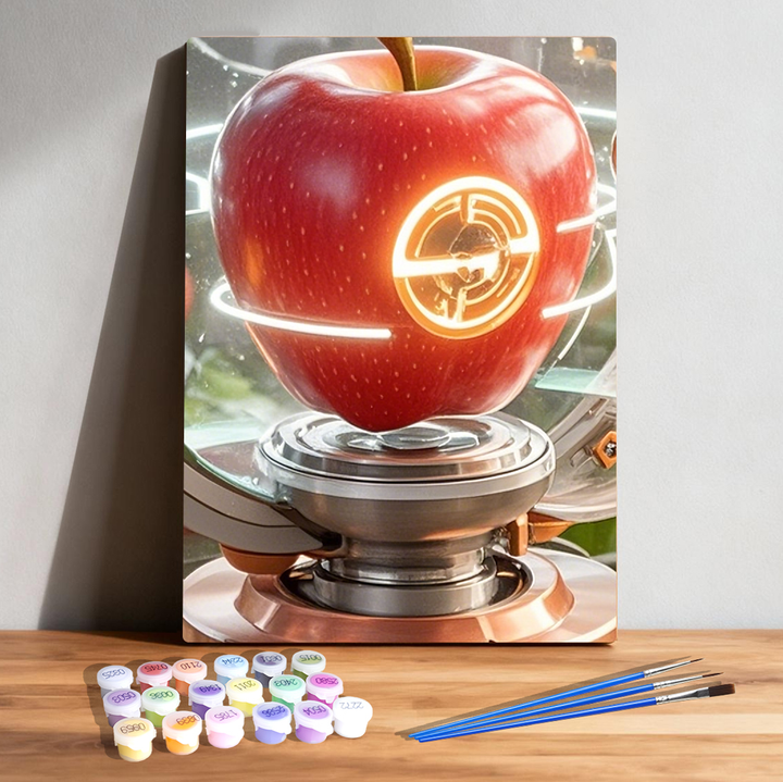 Inside a glass energy chamber, a radiant apple floats mid-air, surrounded by copper circuits and holographic light —