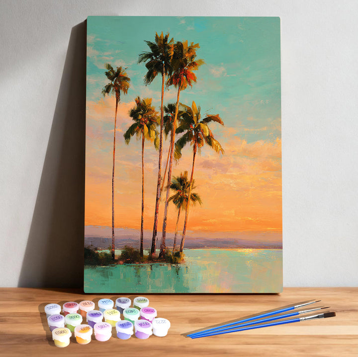 ✨ Paint a golden tropical moment where tall palms meet a calm and glowing sea.