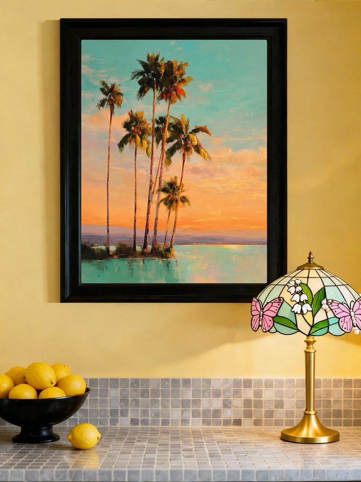 Sunset Palm Rise captures a dreamy tropical moment—slender palms glowing in orange sun, soft pastel clouds stretching across the horizon, and calm turquoise water reflecting the last light of day.
