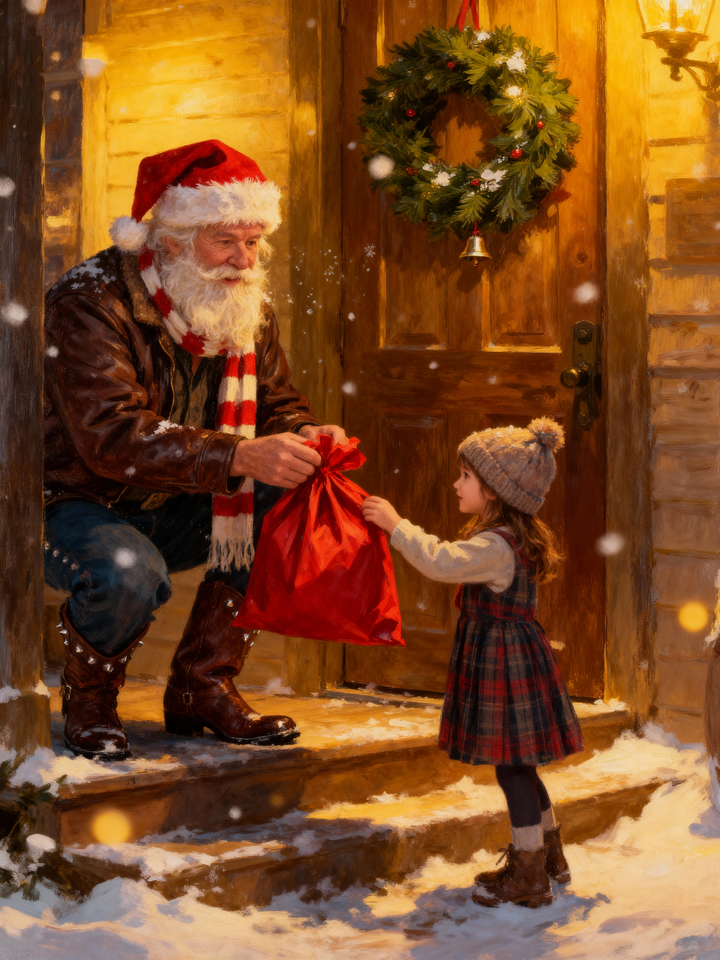 Heartwarming Western Scene – Santa and child under soft snowlight.