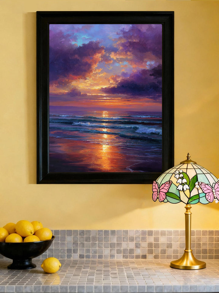 Twilight Ocean Glow captures a breathtaking seascapeāradiant sunset light melting into violet clouds, golden reflections stretching across the water, and gentle waves rolling toward shore with soft turquoise highlights.