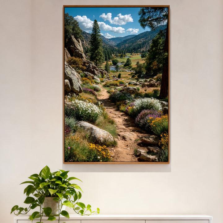 “Valley Bloom Path” leads you through a blooming mountain trail — golden daisies, purple heathers, soft clouds drifting above pine-lined ridges, and a peaceful valley stretching into the distance.