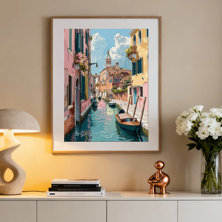 Venice Blossom Canal captures a quiet Venetian walkway, pastel buildings glowing under the afternoon sun, and soft flowers spilling over balconies.