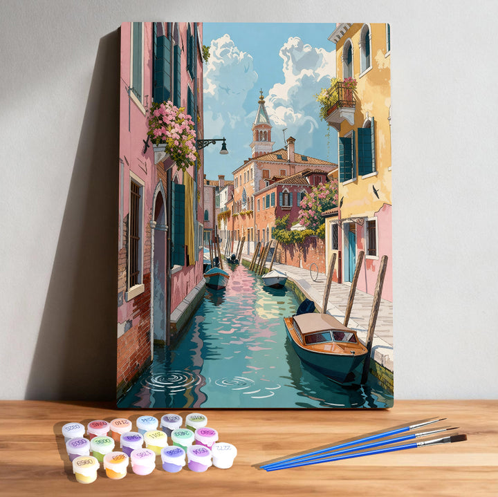 Paint a sunlit Venetian canal lined with pastel houses, blooming flowers, and quiet wooden boats. This relaxing travel-themed paint by numbers kit captures the charm of Italy with bright colors, clean outlines, and a dreamy Mediterranean mood.