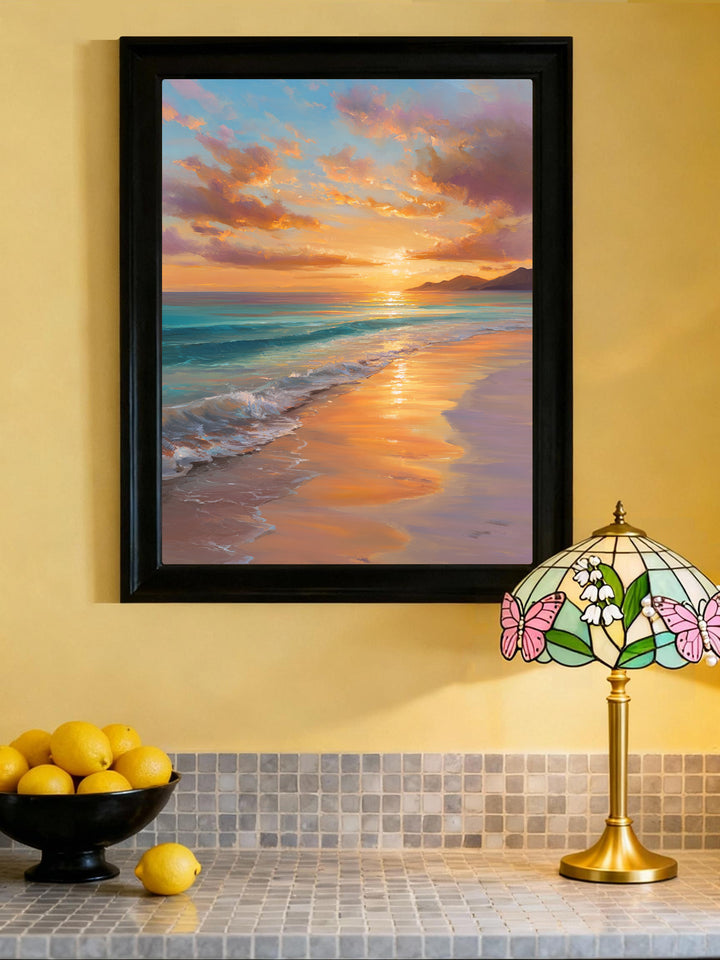 It blends dreamy pastels with vivid ocean hues, creating a serene and romantic coastal moment.