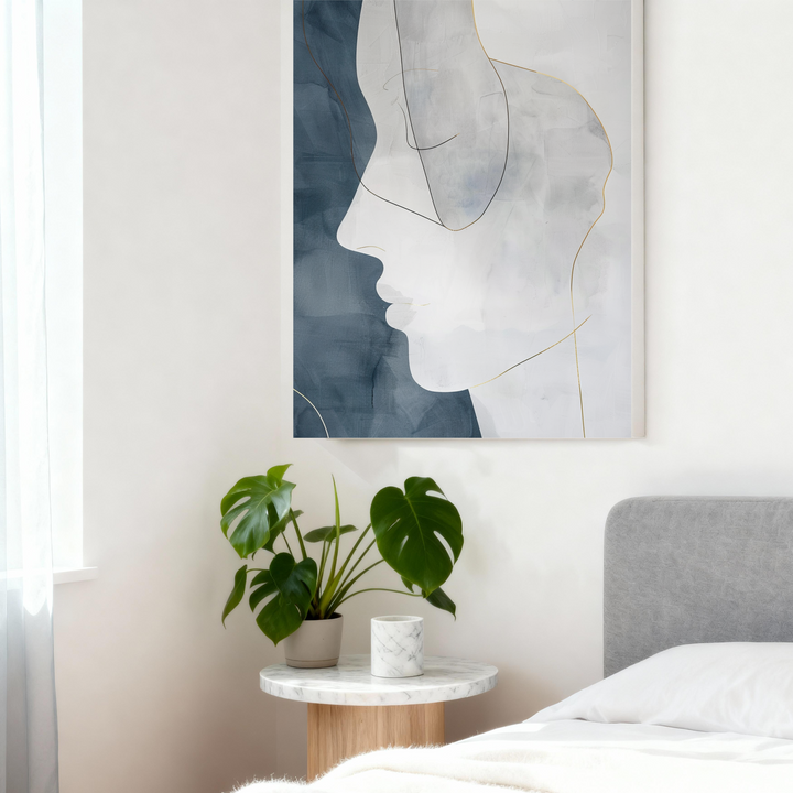 Whisper Form – Abstract Minimalist Line Face Art | Blue & Gold Zen Portrait
