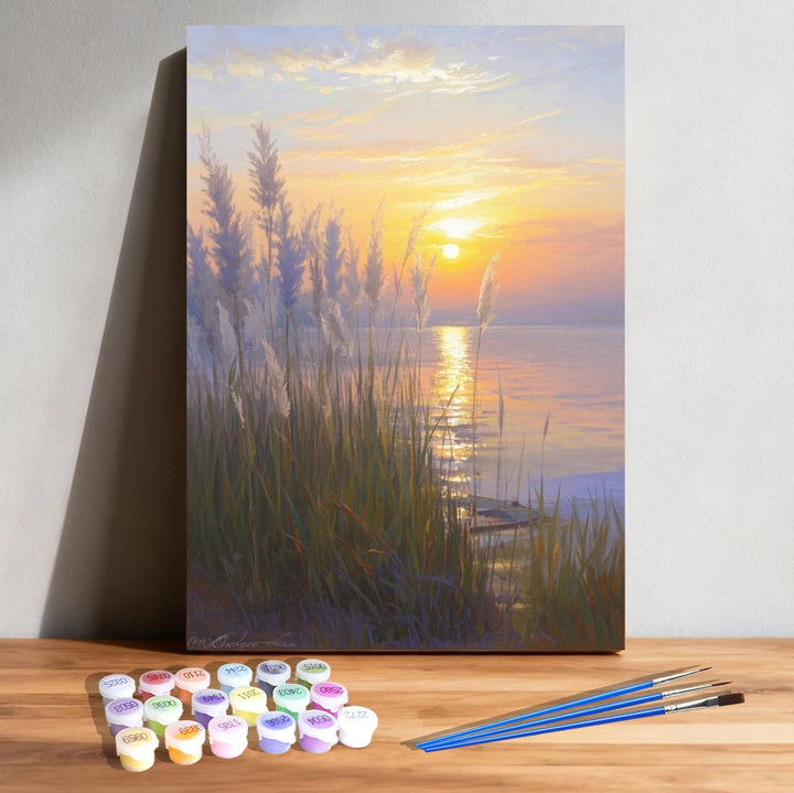 Awaken to the quiet beauty of a new day with Whispering Dawn, a paint-by-numbers kit that captures the tender meeting of sunlight, mist, and still water.