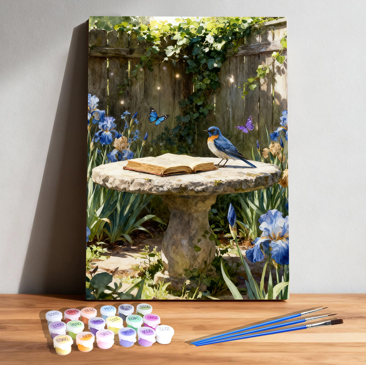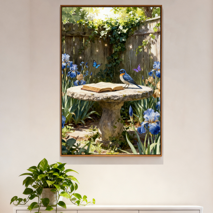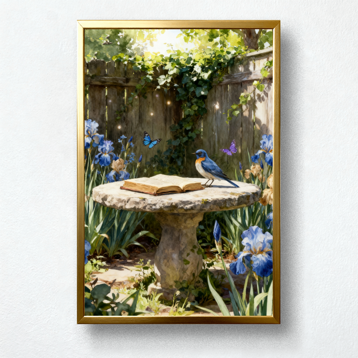 Whispering Garden Pages captures the magic of a peaceful spring morning — soft sunlight falling through leaves, butterflies drifting like living brushstrokes, and a small bluebird standing next to an open book as if ready to read aloud.