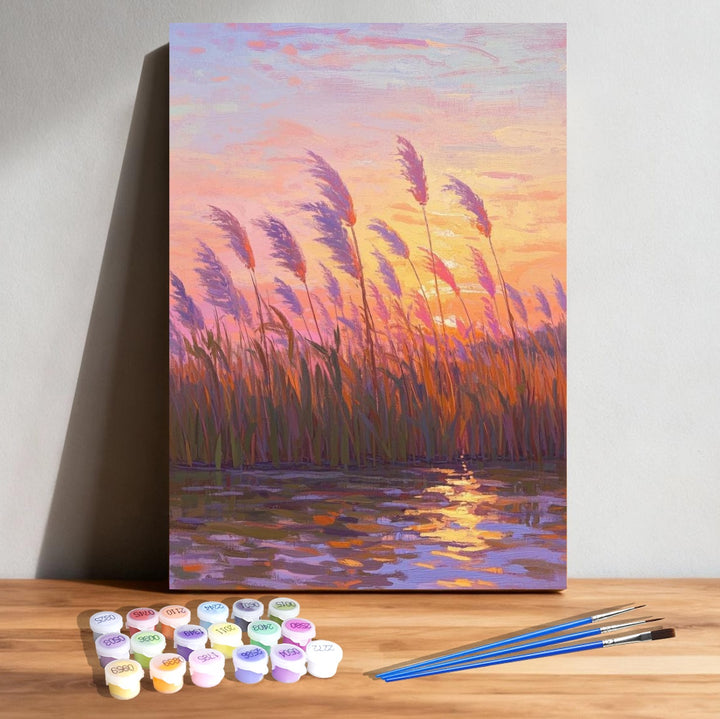 Feel the warmth of dusk settle over still waters with Whispering Reeds, a paint-by-numbers kit that captures the golden hush before nightfall.