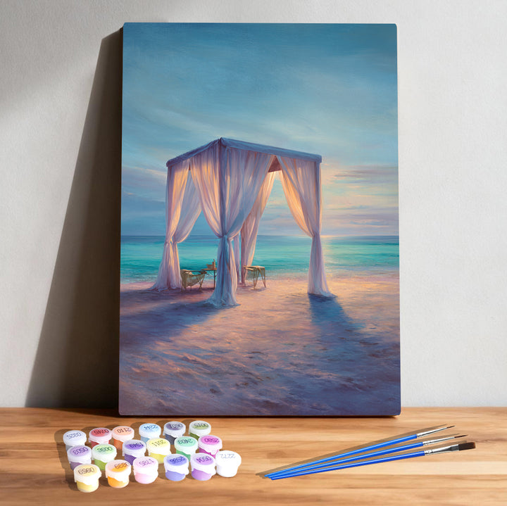 Moonlit Canopy Haven captures an intimate beach cabana draped in sheer white fabric, glowing gently against the pastel evening sky.