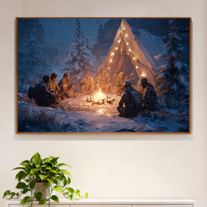 ā€œWinter Campā€ captures the rare tenderness of cold nights — a circle of friends gathered around the fire, snow falling softly outside, and the world pausing in peace.